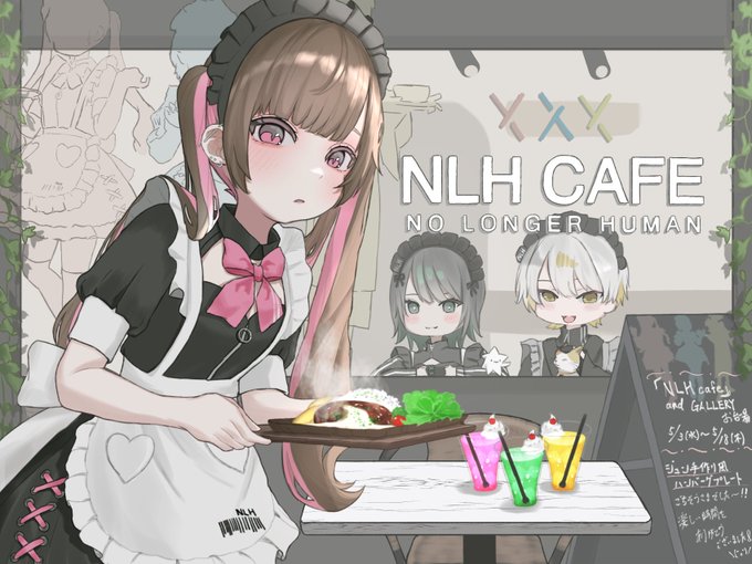 はむねずこさん/ときわたさん/さくしゃ2 さん合同展 「No Longer Human OSAKA」でのサイン会参加させていただきました!!😭 御三方へのお気持ちとこれからのNLH人気を少しでも後押しできればいいなと思って記念イラストを描かせていただきました!🙏✨ #NLHcafe #ジュンたん描いた #NoLongerHuman