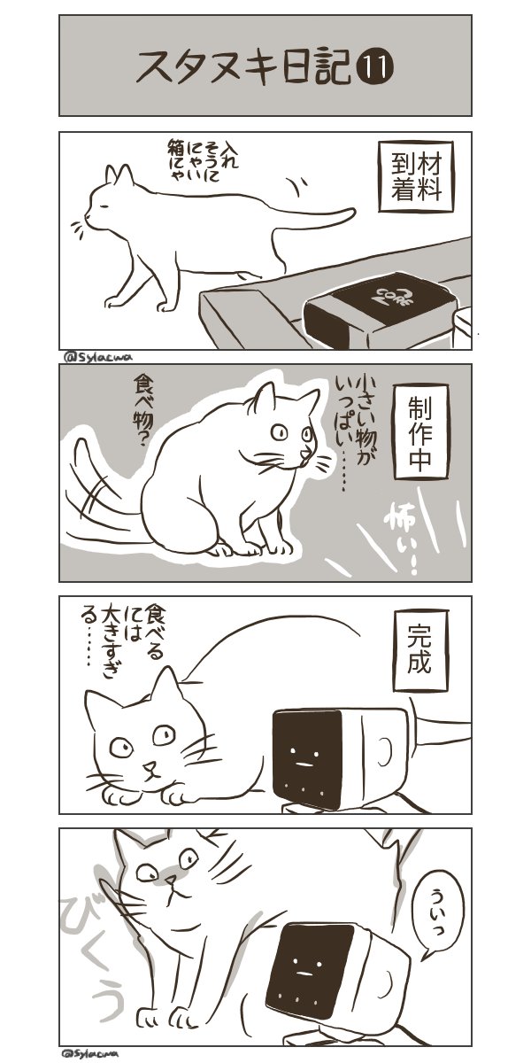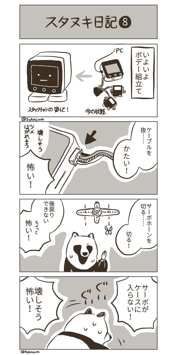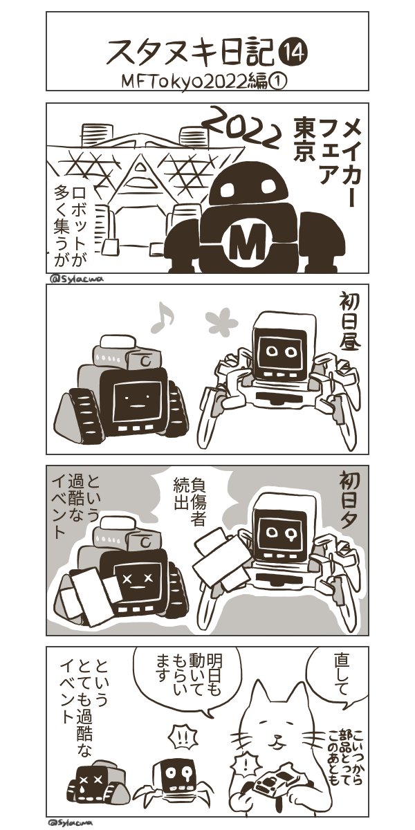 #スタックチャン に癒されるタヌキの日記 第14話(再)&第15話(新)ぽん。 過酷なイベント #MFTokyo2022 のこと。 そして最終日の夕方には今度はメイカーご本人の脚が棒になってしまうって聞いたぽん……🙀 #スタヌキ日記 #4コマ漫画 #漫画が読めるハッシュタグ