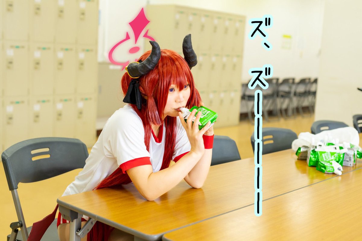 *コスプレ* ブルーアーカイブ 赤司ジュンコ 1人無心でズズルだけの図 Photo:帆立貝さん(@hotate_gai) 角:ここね舎様(@kokone_tuno ) #0214キヴォトス大運動会 #블루아카이브 #0214키보토스황륜대제 #ブルアカ