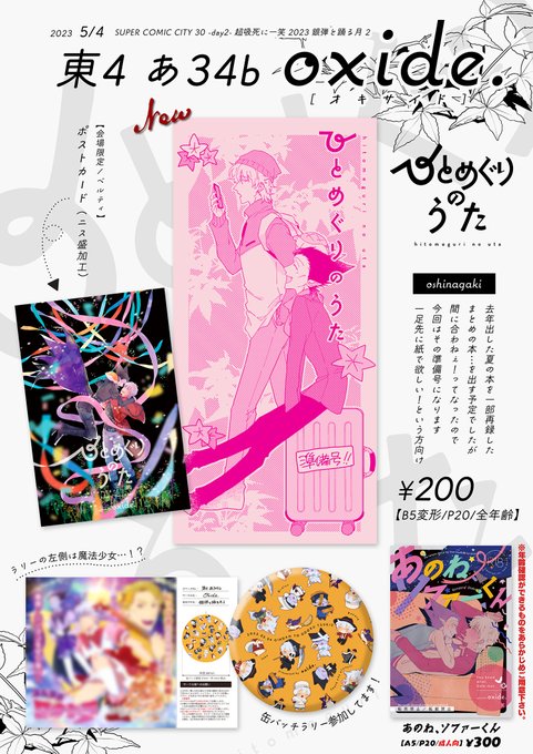 【5/4のお品書きとpixivサンプル】 東4 あ34b 〈oxide.〉 pixiv:pixiv.net/artworks/10768… 準備号と既刊、缶バッチラリーがあります! ノベルティは表紙になる予定だったやつのポストカードです twitter.com/akasabi_94/sta… #0504銀弾と踊る月2