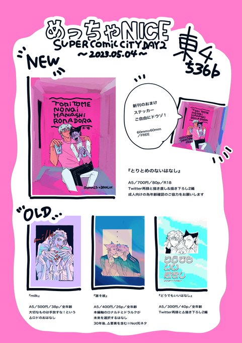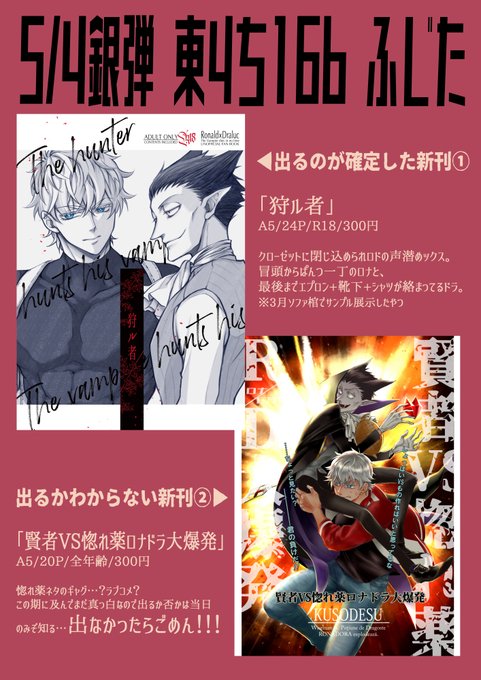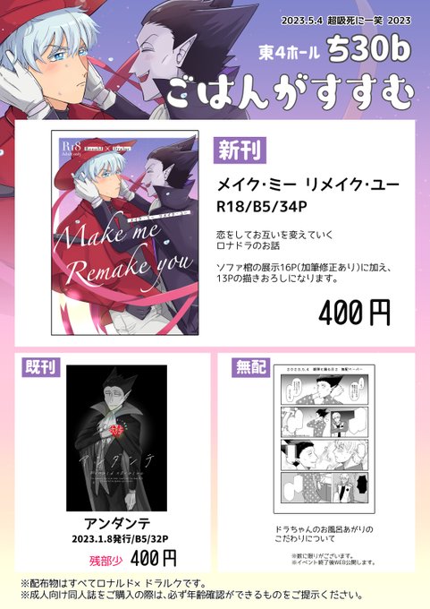 5/4 スパコミお品書き【東4ホールち30b /ごはんがすすむ】 机の上すべてロナドラです。無配ペーパー用意してますのでぜひ遊びに来てください!よろしくお願いします! 新刊サンプルtwitter.com/ramenois11/sta… 既刊サンプルtwitter.com/ramenois11/sta… #0504銀弾と踊る月2