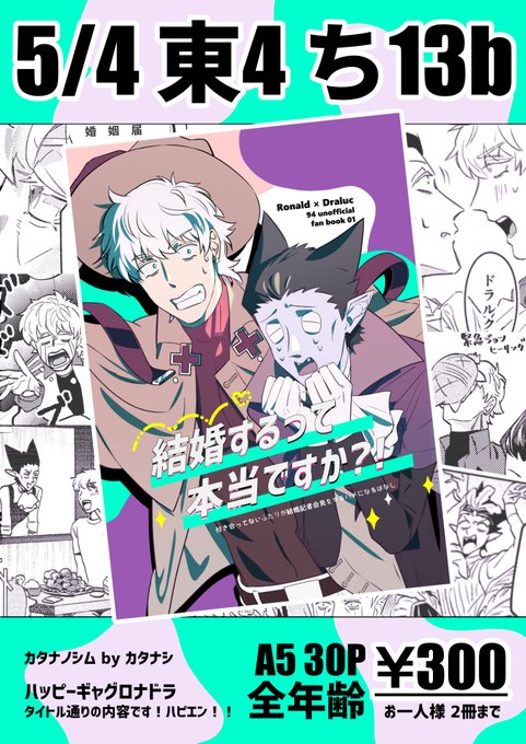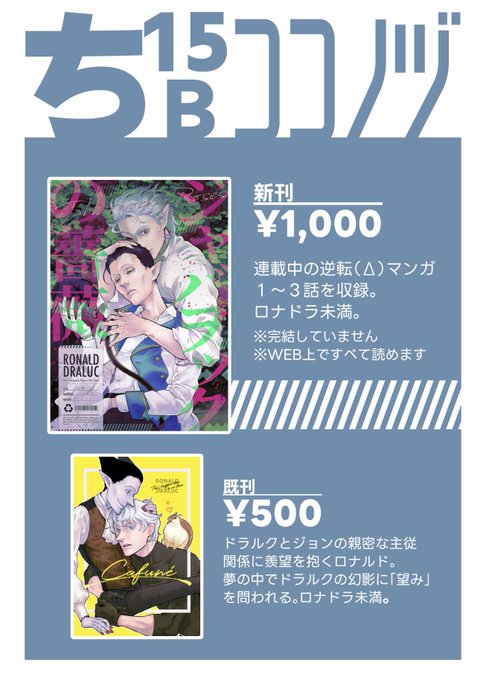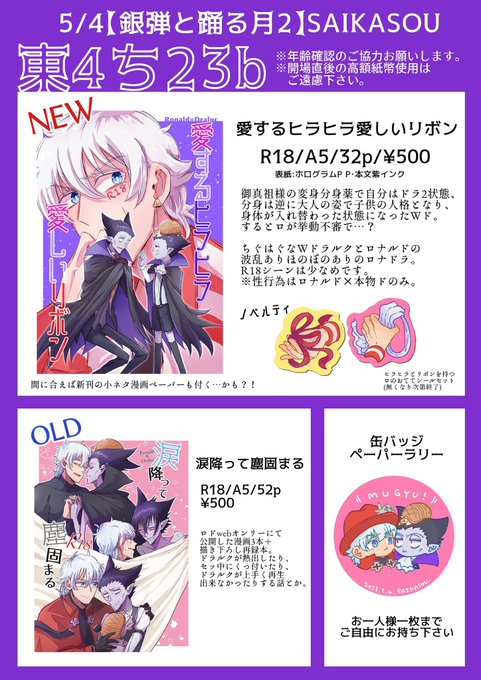 ■5/4スパコミのお品書き■ 【東4ホール ち09a BBB】 本編ロナドラ・Δロナドラの短編集が新刊です! →サンプルと通頒pixiv.net/artworks/10756… 新刊表紙のポスターが目印です💜 #0504銀弾と踊る月2