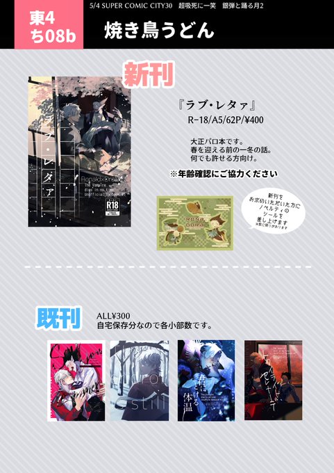 #0504銀弾と踊る月2 5/4スパコミお品書きです。 東4ち23b【SAIKASOU】にてお待ちしてます。 新刊サンプル(支部)↓ pixiv.net/artworks/10740… 🐯通販リンク ※イベ後新刊は追納します。既刊は残部によっては終了予定。 新刊↓ ec.toranoana.jp/joshi_r/ec/ite… 既刊↓ ec.toranoana.jp/joshi_r/ec/ite…