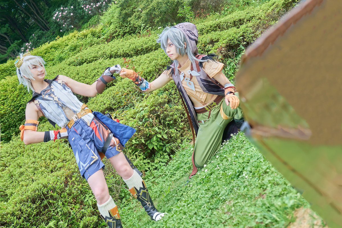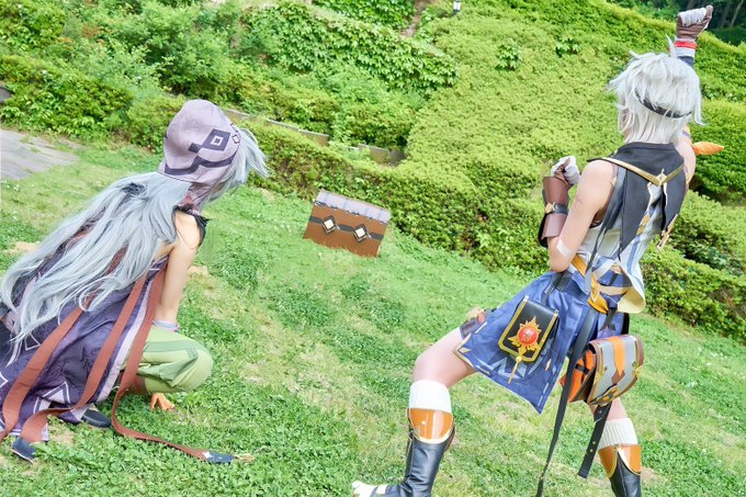 【コスプレ】 原神 🔥ベネット&レザー⚡️ ━━━━━━━━━━ 👍「オレがこんな幸運に恵まれるなんて!」 🐺「箱、収納できる。」 👍「想定内の…不運だ…」 🐺「痛い。」 ━━━━━━━━━━ レザー💜(@mkpnt814) 📸 (@5ryo3369) #0525モンド併せ ※特別な許可を得て撮影しています