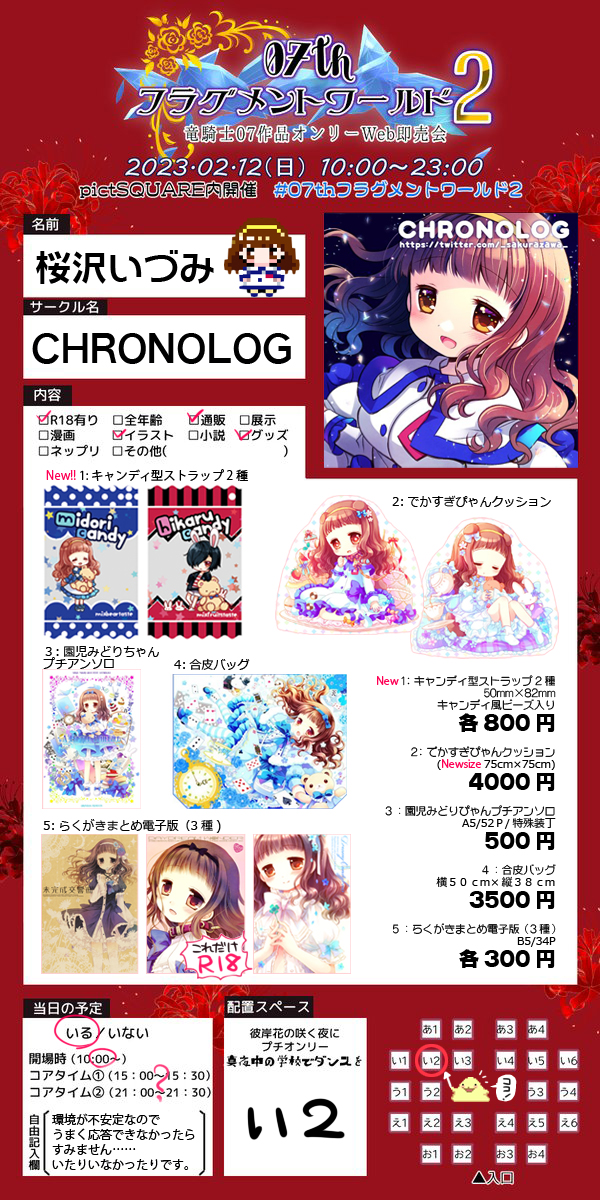すみませんスペース間違えてたのでUPし直しました…!フラグメントワールド2のお品書きです!12日の朝10時よりBOOTHにて通販開始します、当日はよろしくお願いします~! BOOTH▶️chronolog.booth.pm #07thフラグメントワールド2 #07thフラグメントワールド2_おしながき #07thFW_まよダン