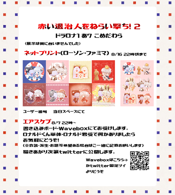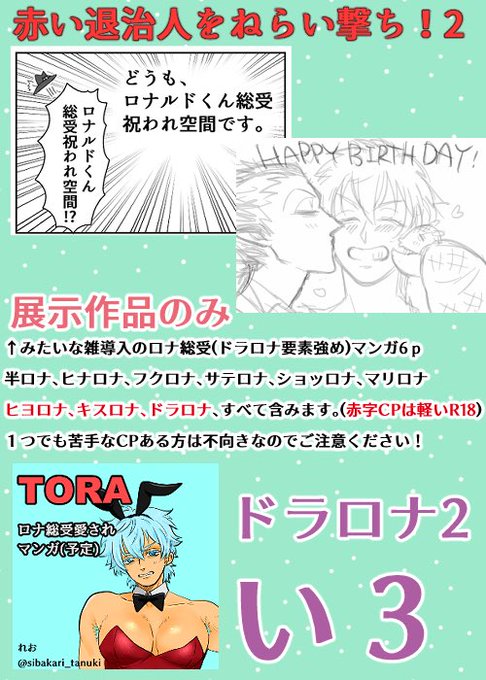 #赤い退治人をねらい撃ち2 #0808狙い撃ち2お品書き ドラロナ2:う5「はいよろこんで」です! 当日おそらくスペースにあるもの ①ロ君誕生日漫画、5ページ ②7/23発行のドラロナ本の通販案内 ③ΔドロのL版ネットプリント 各所のリンク、プリント番号をまとめたページをスペースにて公開する予定です