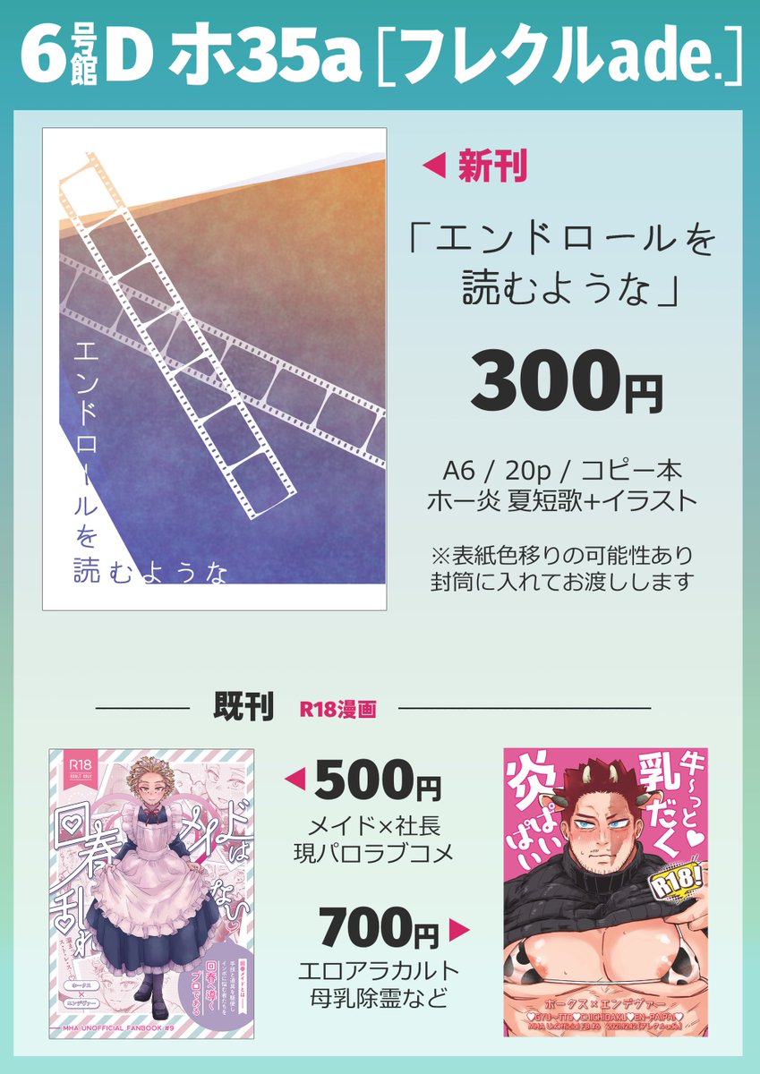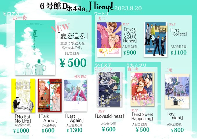 【お品書き】8/20お品書き【ホー炎】 8/20 インテ鷹飛ぶ空はえんじ色のお品書きになります。2枚目は当サークルのいつものポスターです。 サークルNo:6号館Dホ44a サークル名:Hiccup‼️ 既刊もお品書きにあるものは持っていきます。 支部→pixiv.net/artworks/11083… #0820鷹えん新刊情報
