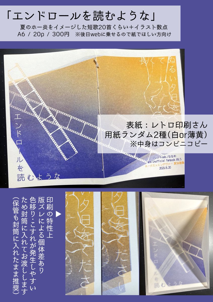 #0820鷹えん新刊情報 明日のインテのお品書きです。ホー炎の短歌+イラスト本と既刊があります。 きよはらさんと隣接で、私ときよはらさんどっちかはスペースにいるはずです。よろしくお願いします!