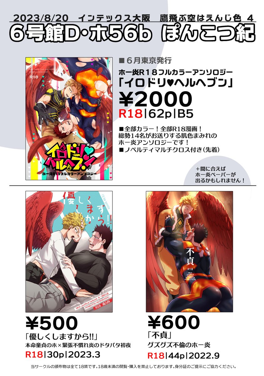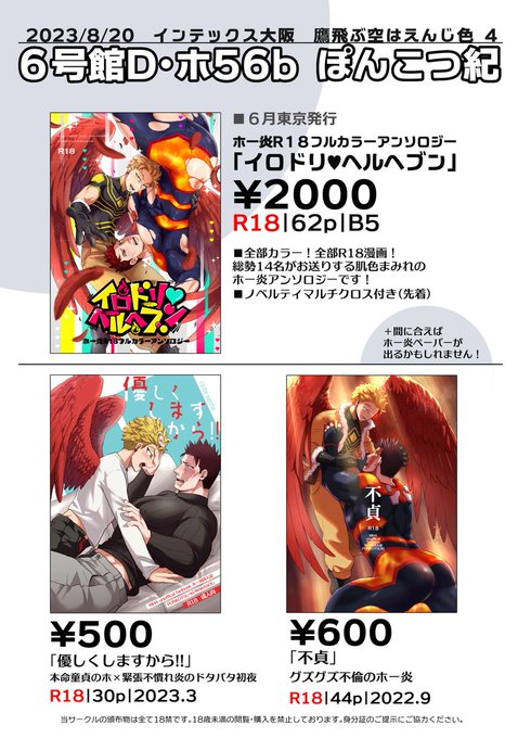 インテ鷹えんお品書きです~ ホー炎の既刊と6月に発行したフルカラーアンソロ(@hoen_HFC)を持っていきます🦅🔥 ■6号館Dホ56b「ぽんこつ紀」 ペーパーはこれから作るので頑張ります…! アンソロノベルティそれなりに用意しておりますが先着順なのでご容赦を🙇♀️ #0820鷹えん新刊情報
