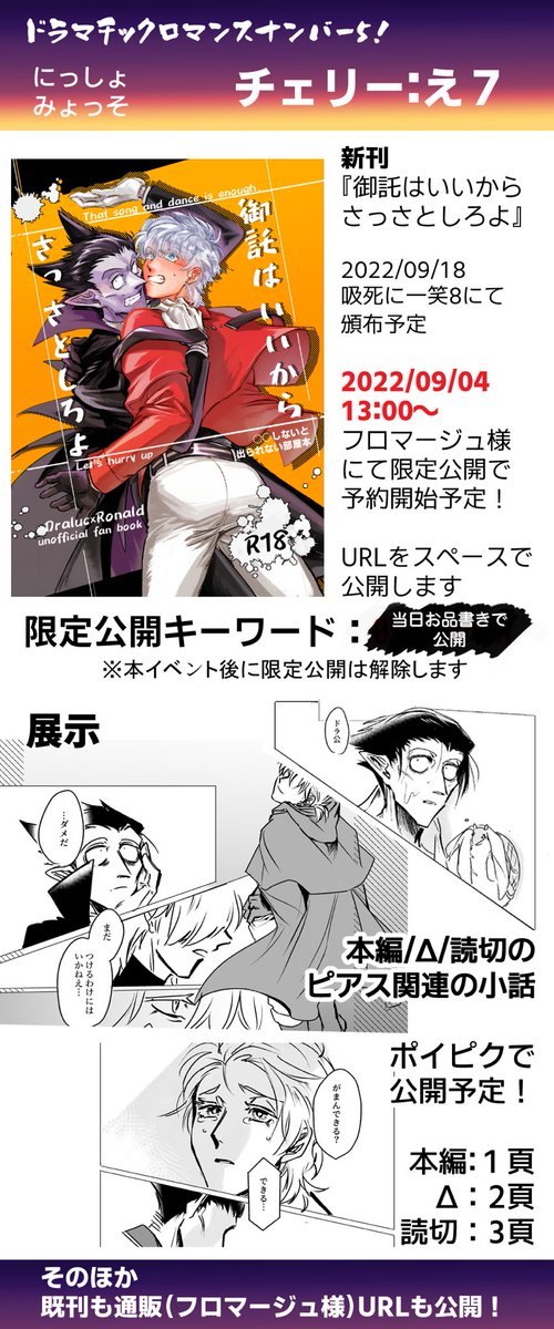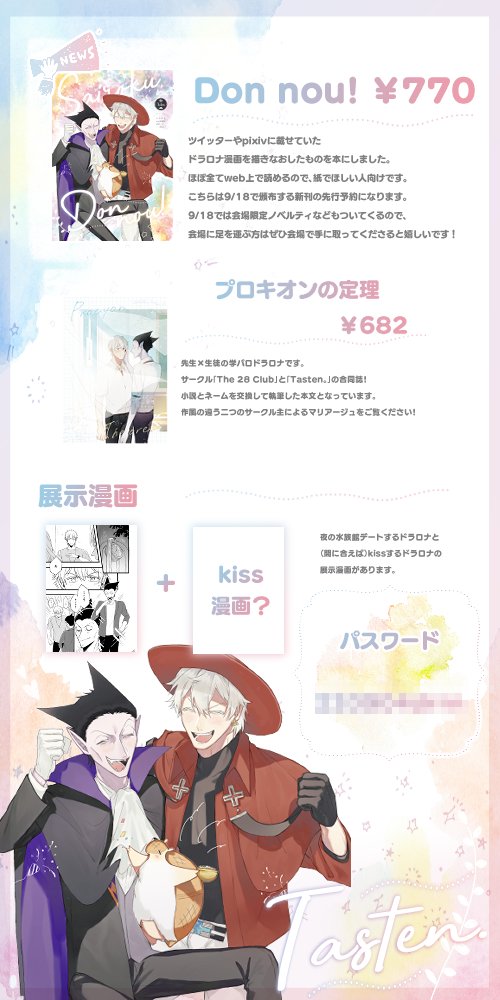 #0904DRweb おしながき詳細とサークル外観+おまけ サンプル等はツリーをご覧くださいませ エアスケブも受け付けようと思っています! 当日お昼(おそらく12時)ごろにTwitterの方でご案内させて頂きますのでお待ちくださいませ!