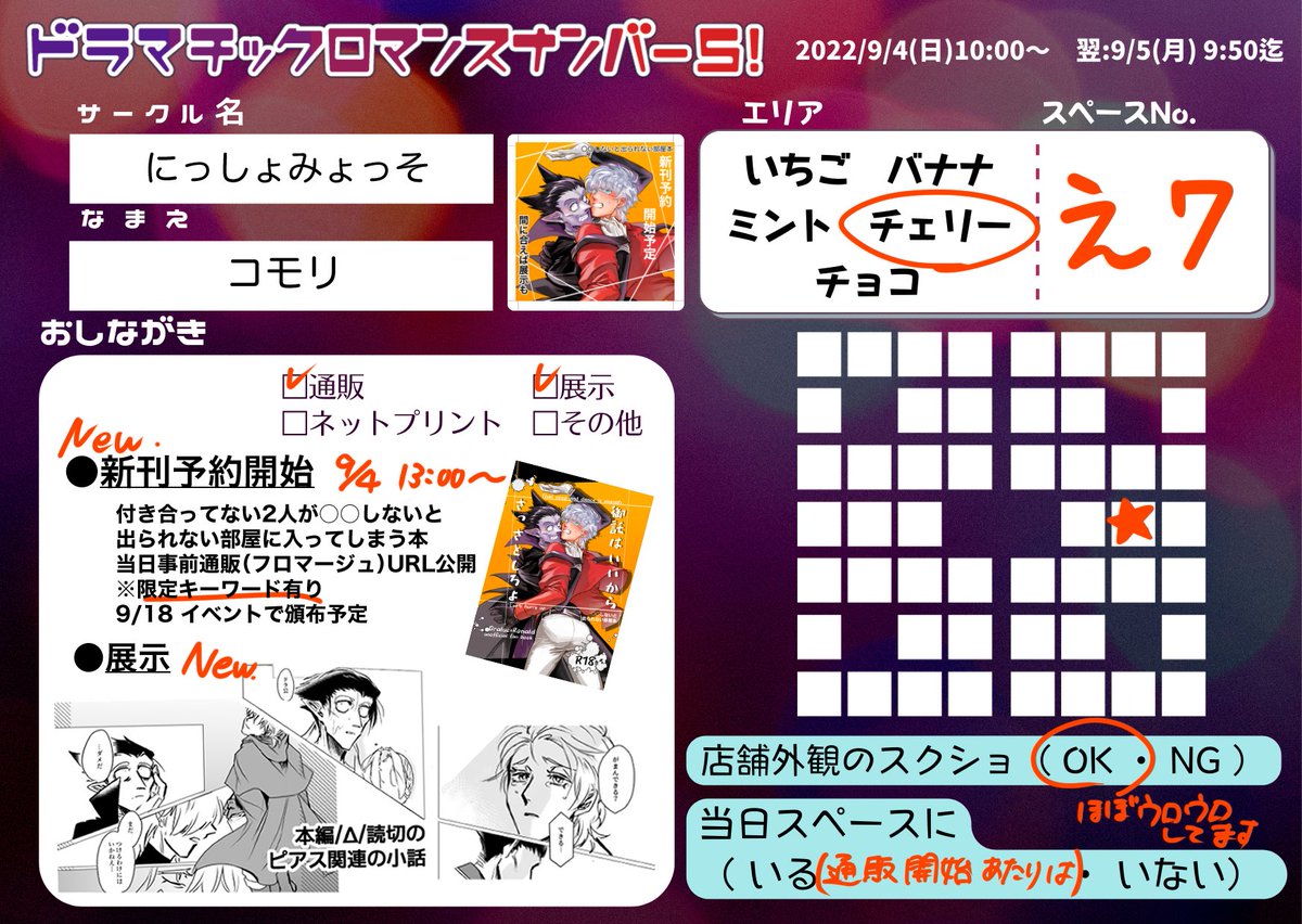 スペース【🍒え7】 テンプレートをお借りしました! 当日は事前通販のURLとページへのキーワードを公開して13:00〜予約開始予定です 展示もちょっとあります👋 よろしくお願いします #0904DRweb