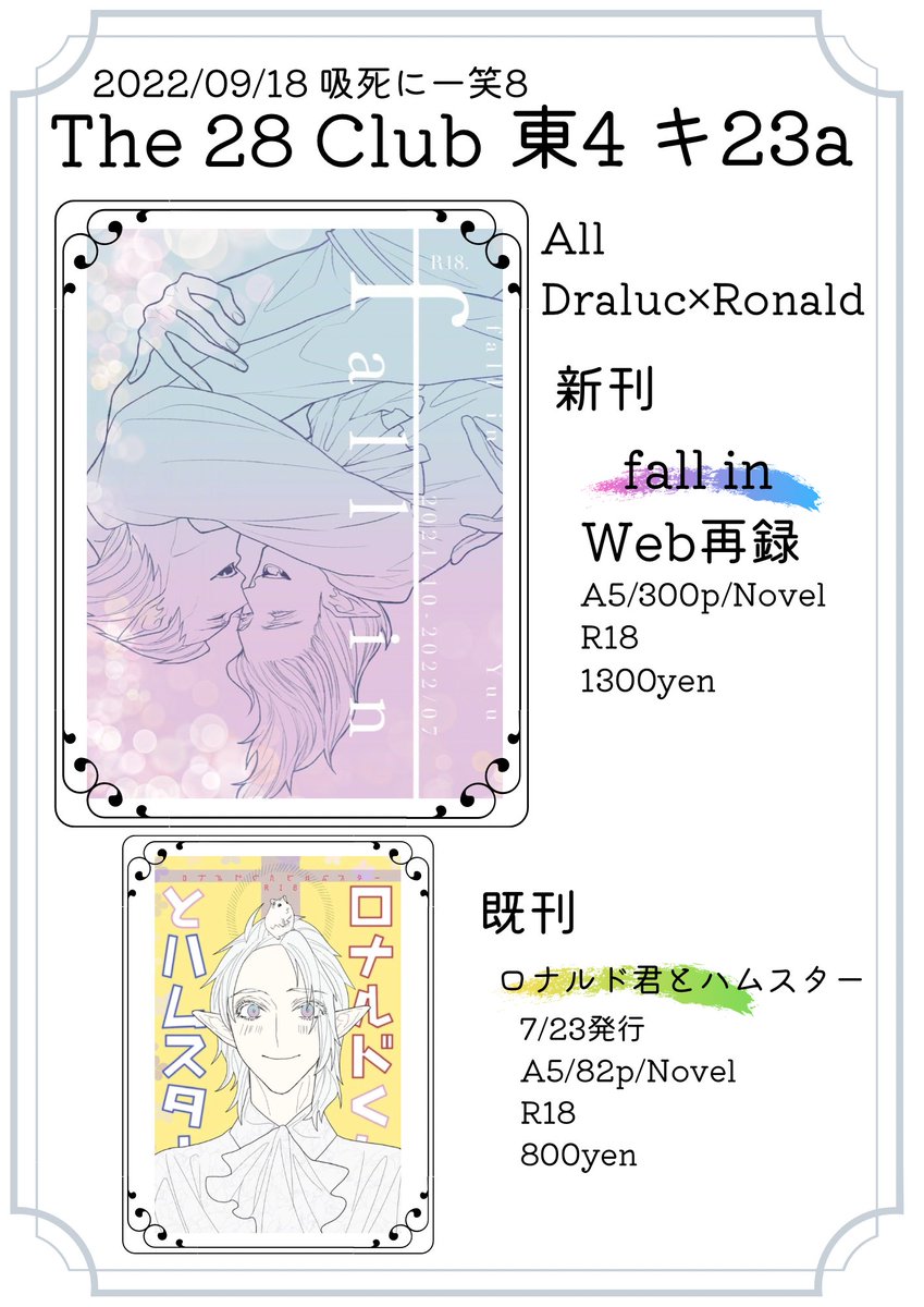 #0918ドロ情報 東4キ23a The28Club 新刊:Web再録「fall in」300p 既刊:ロ君とハムスター 82p トリオキニ: triokini.com/circle/item/li… 新刊サンプル: twitter.com/dr_yuu0202/sta… よろしくお願いします!