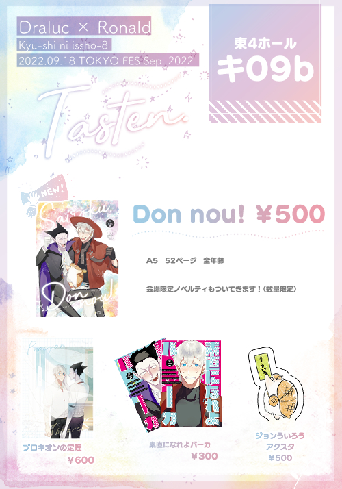 9/18 吸タヒに一笑8 東4 キ09b Tasten。お品書き よろしくお願いします! 2枚目はポスターです~ 目印にしてください! ポスターもトリオキニに置いておくのでほしい方いたらどうぞ~!! トリオキニ→triokini.com/circle/item/li… 新刊サンプルはツリー↓↓ #0918ドロ情報