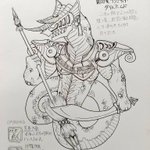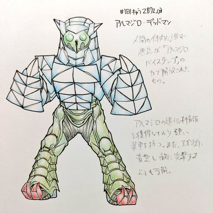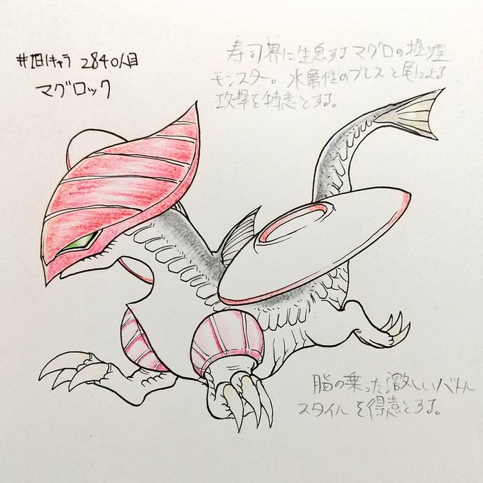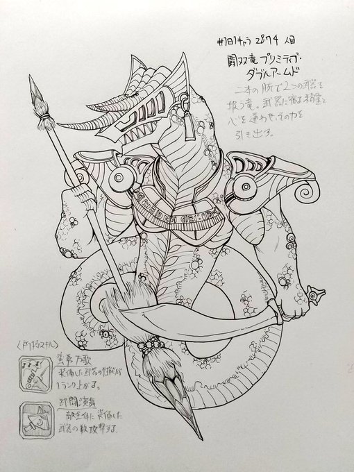 #1日1キャラ 2874人目 闘双竜プリミティブ・ダブルアームド…同じモンスターのバリエーション違いという概念が好きなので自分が描いたモンスターでもそういうのがやりたい 二体目のダブルアームド↓ twitter.com/ot0718ku/statu…