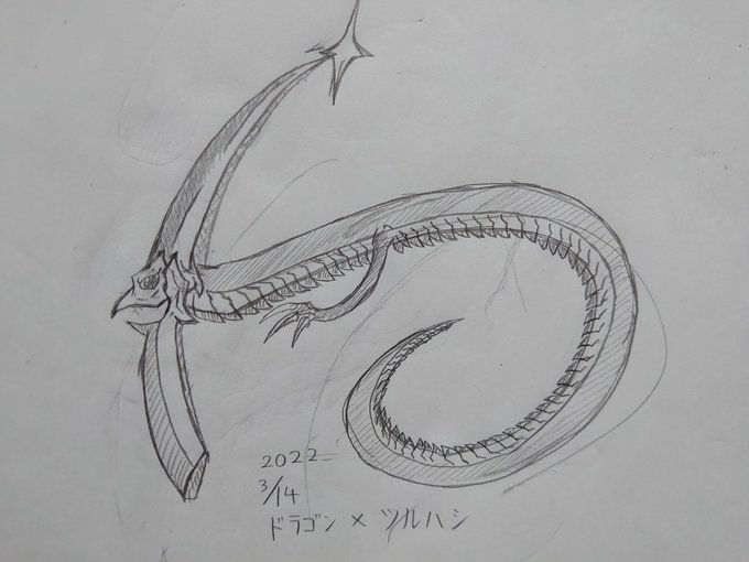 #1日1ドラゴン ドラゴン×錨(リメイク) ラフ画 顔に錨の部分を加えて背中の棘も錨の突出した部分をデザイン。 錨は鎖があったので、暴れて千切れた感じにしました。 #イラスト好きな人と繋がりたい #絵描きさんと繋がりたい #ドラゴン絵 #イラスト