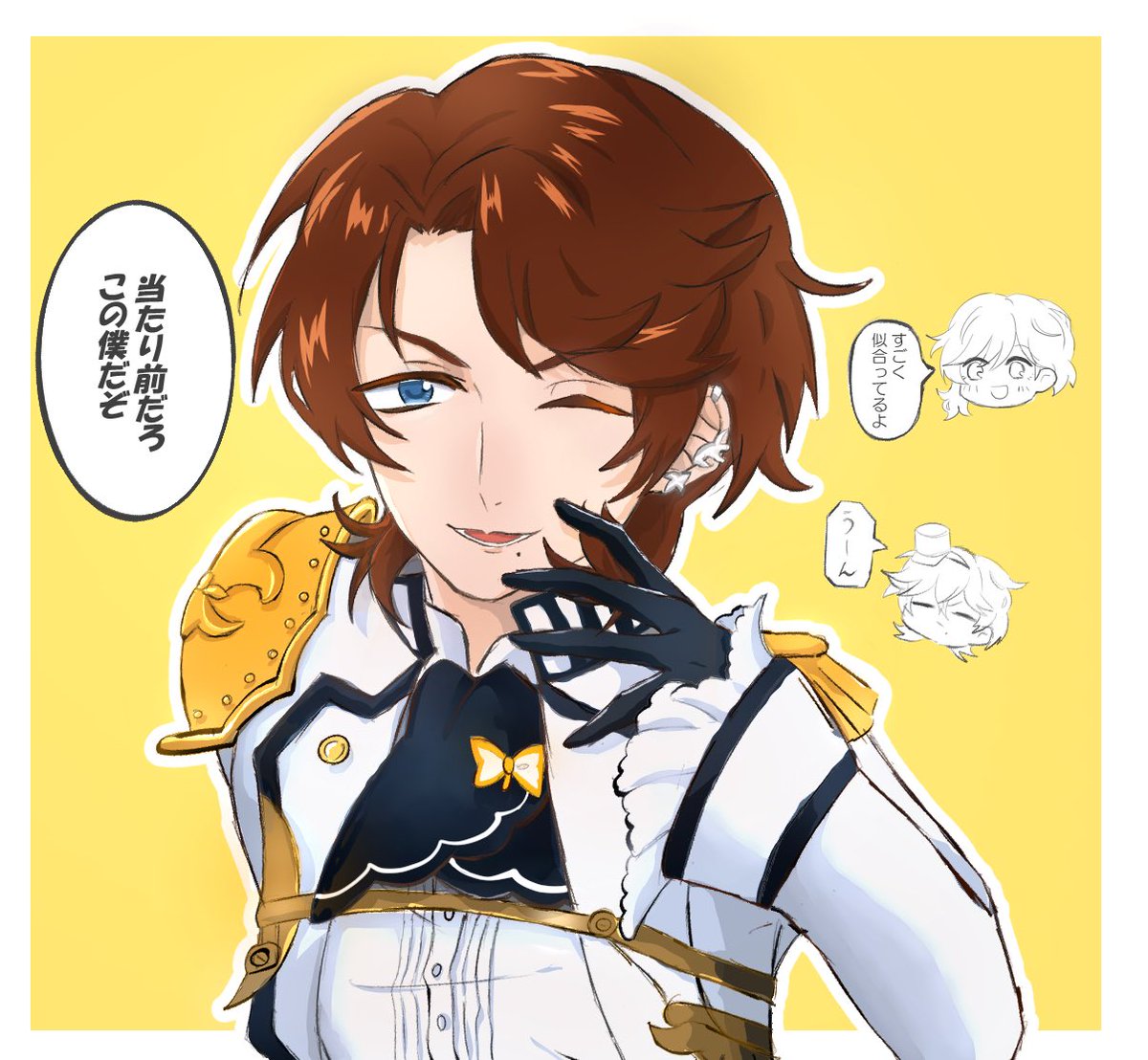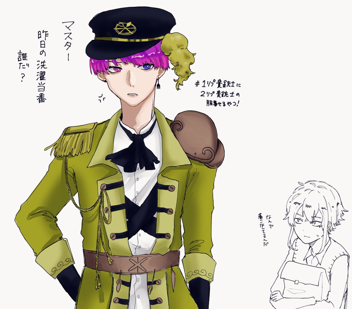 はちゃめちゃ遅くなりましたが いつぞやのタグやりました!!!楽しかった(*^-^*) お題提供ありがとうございました!! #1014R_FA #1番目にリプきた貴銃士に2番目にリプきた貴銃士の服を着せる twitter.com/lc_srsj1004/st…