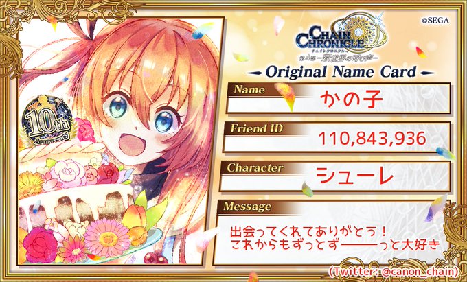 改めましてユグド祭ではありがとうございました〜! 沢山のチェンクラさんとご挨拶できて、繋がれて嬉しいです🙏 マイペースにTwitterやってますがこちらでもよろしくお願い致します✨ 当日配った名刺を再UP 2枚目は過去絵詰めただけの裏面👌3枚目は文字なし #チェンクロ #10周年の義勇軍名刺