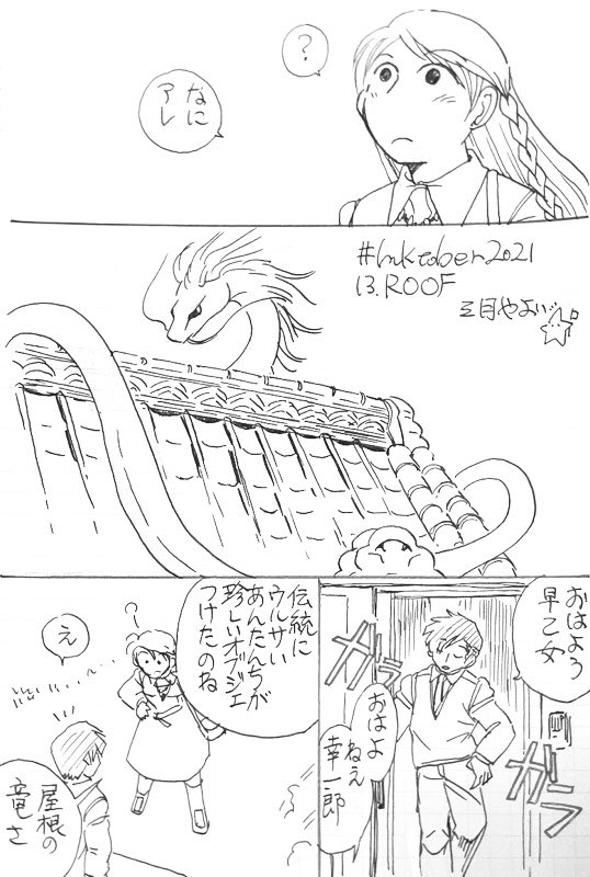 #inktober2021 #inktober #インクトーバー2021 #10月は鍛練の月 ロスタイム突入です 13.ROOF 順不同で、できるところから_(:3」z)_ poipiku.com/6617/5543443.h… ワクチン接種の後の副反応で未完成にになってたやつです_(:3」z)_