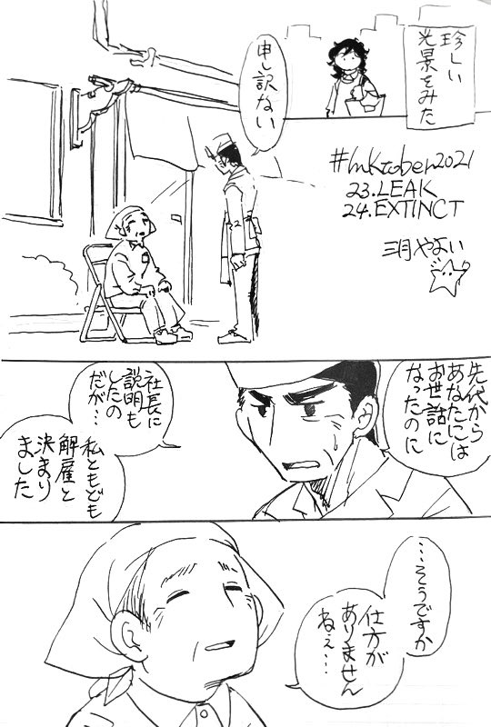 #inktober2021 #inktober #インクトーバー2021 #10月は鍛練の月 ロスタイム 23.LEAK 24.EXTINCT 無理矢理二題噺にしました。みちのくコミティア会場で描いてたものです poipiku.com/6617/5594719.h…