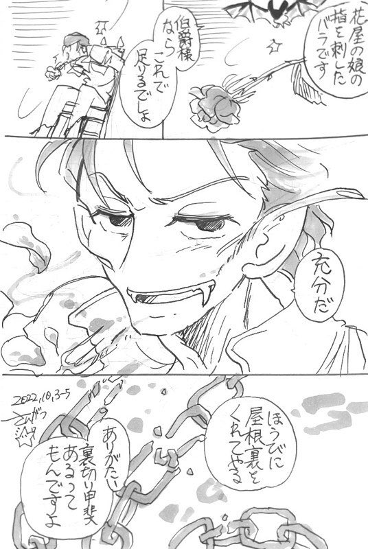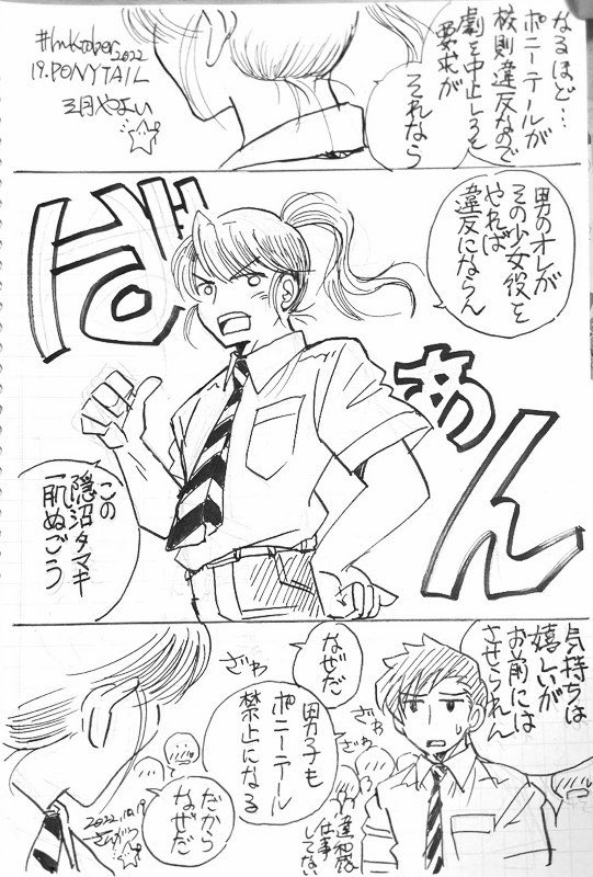 #inktober2022 #inktober #インクトーバー2022 #10月は鍛練の月 19.PONYTAIL これ「ばぁん」が描きたいだけだな、と気がついて、いろんな矛盾を無視しての1p漫画です poipiku.com/6617/7693481.h… 今日は巳の日と聞いたので玉環を出したかったのです(^◇^;)