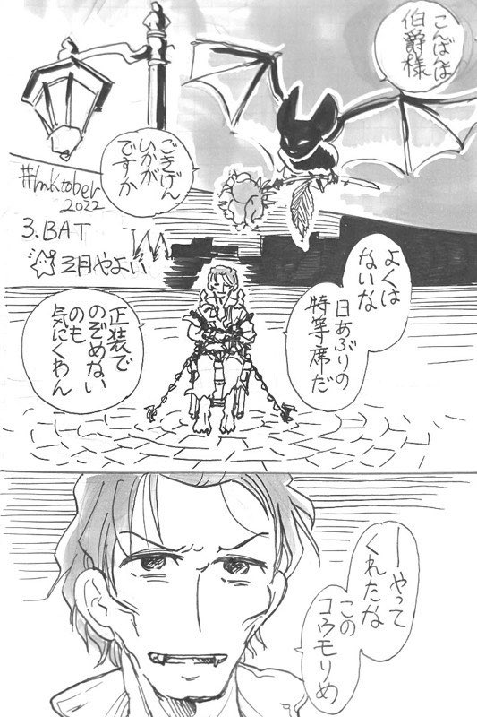 #inktober2022 #inktober #インクトーバー2022 #10月は鍛練の月 3.BAT 無理をしすぎた_(:3」z)_まずいぞ(体力が) poipiku.com/6617/7614216.h… ド真夜中に投稿しても目に止まらない可能性が高いですが、後回しにすると忘れそうなので_(:3」z)_