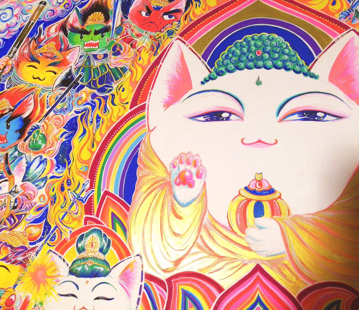作品制作中「薬師如来猫」背景の彩雲や細かいところ微調整始めたら止まらないけど、こんな時間なのでそろそろ寝ます。もう少しです! #アナログイラスト #猫好きさんと繫がりたい #創作クラスタさんと繋がりたい #猫イラスト #三菱ユニポスカ #10月個展