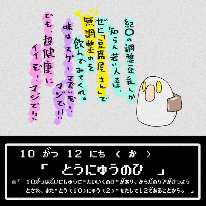 『#10月12日🍀 #豆乳の日 』 色々なフレーバーの調整豆乳も良いけど、やっぱりそのまま絞りたて無調整豆乳が身体のためには良き(๑•̀ㅂ•́)و✨ SOYMILK万歳🤤🙌❣️ #一日一絵 #イラスト好きさんと繋がりたい #ゆるいイラスト #雨雪キリン絵 #みんなで楽しむTwitter展覧会 Happy Tuesday( ¨̮ )❣️