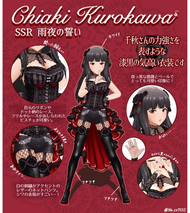 衣装が天才すぎて言いたいところいっぱいあるけど、なによりヘッドドレスが素晴らしい… ハーフツインっぽくも見えるし、ヘッドドレスのおかげでハードすぎず可愛くなってる #10月20日は雨夜の誓い実装記念日