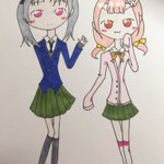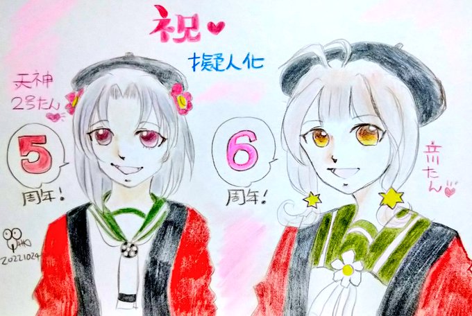 フライング上等( ・`ω・´)ノシ← のんびり可愛い立川たん🌟 おっとり優しい天神2号たん⛩️ お二人がこれからも楽しく幸せでありますように💕 #10月25日は天神2号たん擬人化5周年 #10月25日は立川たん擬人化6周年 #ビッカメ娘を描き隊 #アナログ絵