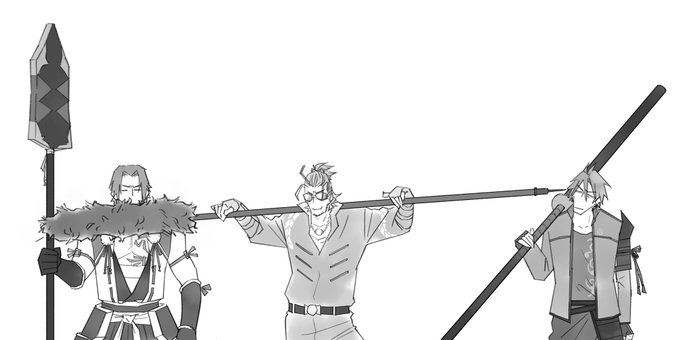 #10月3日は天下三名槍の日 複数描くの苦手な上にアナログ鉛筆で描けるけど、消しゴムがないので一発勝負というあまりにもあんまりな落書きですがお祝いしたいので! 三人描いたからえらい!と自分で思っておきますw