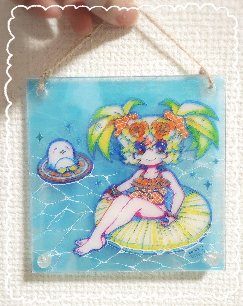 アクリル板4枚とガラス絵の具を使用した涼しげで夏らしい作品が出来ました🙌✨ 今週末の100均チャレンジに持っていきます! アクリル板、ガラス絵の具、麻紐が100均の商品です💯 #100均チャレンジ #みんなで楽しむTwitter展覧会 #アクリル板アート #ガラス絵の具アート