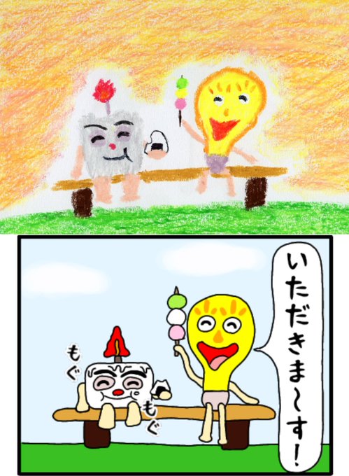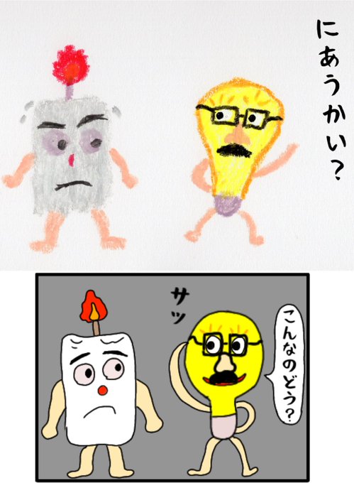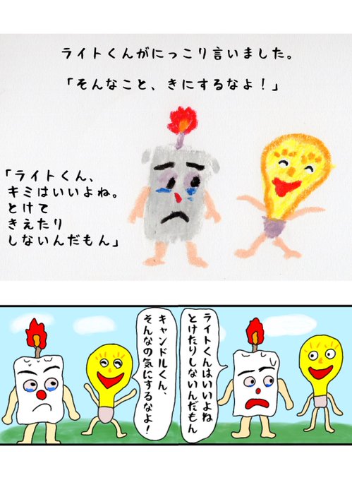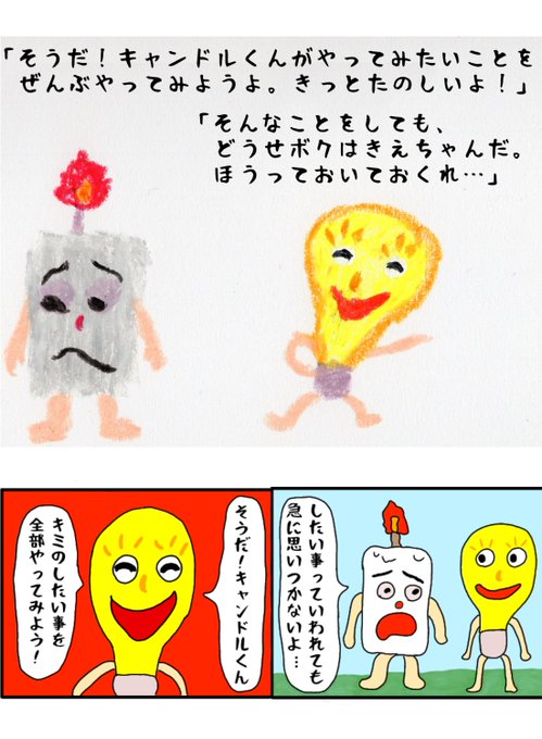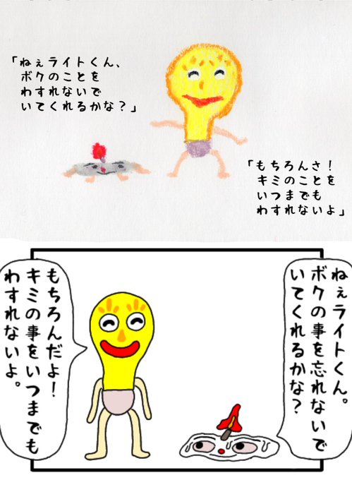 「キャンドルくんとライトくん」 絵本と四コマの比較 〈4〉 #絵本 #絵本ひろば #読み聞かせ #イラスト #クレヨン #絵本作家 #イラスト #アトリエの系譜 #絵描きさんと繫がりたい #落書き #100日後に消えるキャンドルくん #えほん #絵柄が好みって人にフォローされたい #漫画が読めるハッシュタグ