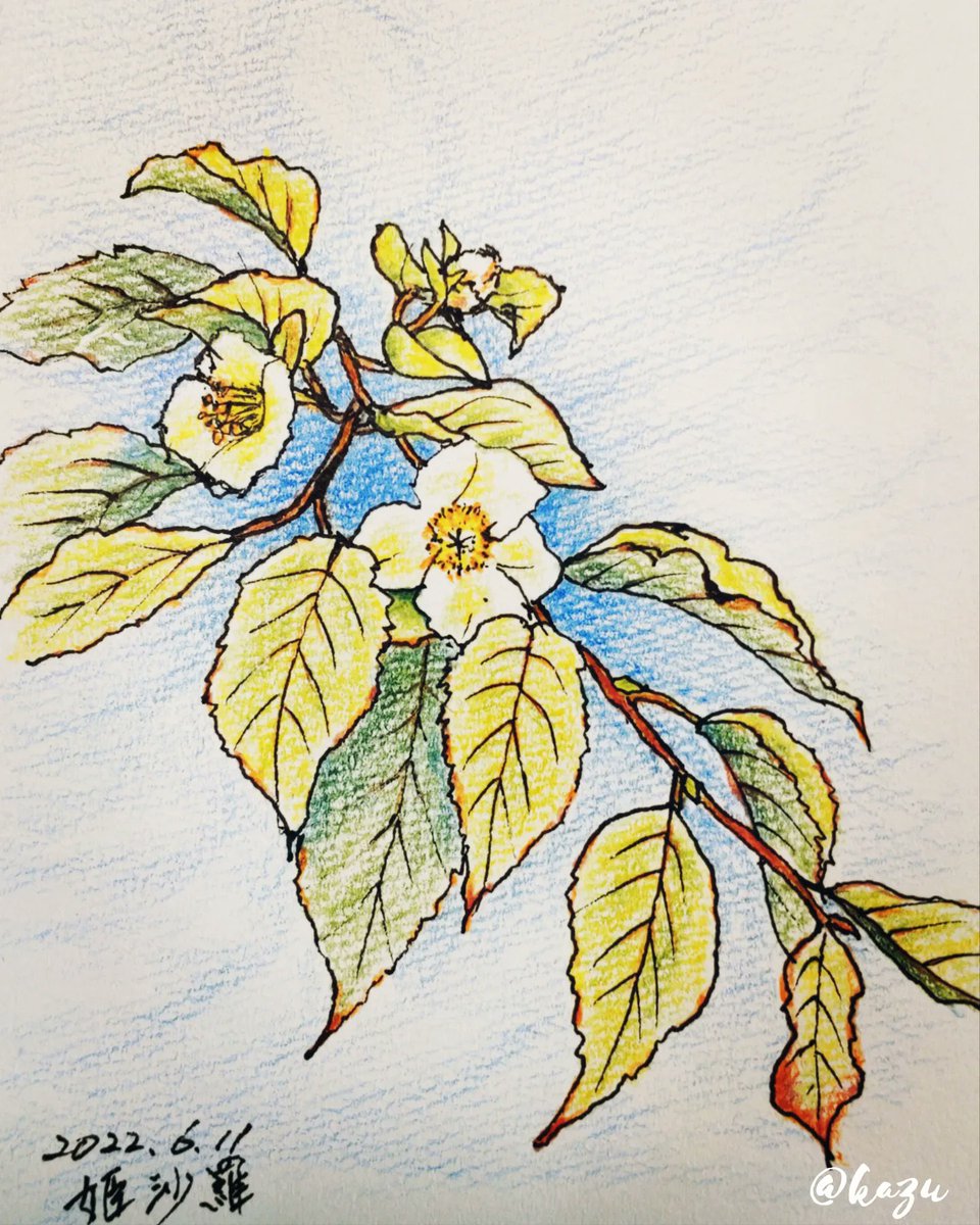 11/6/22 「姫沙羅」。玄関先の花壇に咲いた姫沙羅の花をスケッチしました。水彩色鉛筆で彩色し、敢えて水塗りせず、ザラザラ感を残してます。 スケッチは、10分でしたが彩色の方が時間かかりました😂 #つらら庵お散歩スケッチ #10分スケッチ #姫沙羅の花 #10minutes sketch #花の絵 #水彩色鉛筆画