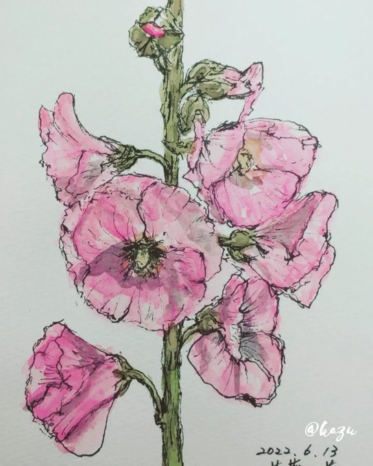 13/6/22 「芙蓉の花」。10分スケッチに透明水彩で彩色しました。 夏が近いと感じます。 今回は、背景に着彩しませんでした😆 #つらら庵お散歩スケッチ #10分スケッチ #10minutes sketch #芙蓉の花 #花の絵 #美しい花