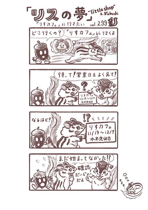 #1日1絵 過去の絵。#11月9日 1枚目 昨年のマンガ「リスの夢」 #りすカフェ 今年は11/25〜。 2枚目りすカフェで前年はご懐妊中、翌年赤ちゃんとのご来場や、お子様とご来場の方も。 りすパフェがあった年も。 冬眠してる場合じゃない! #リス #シマリス #イラスト #illustration #illustrators