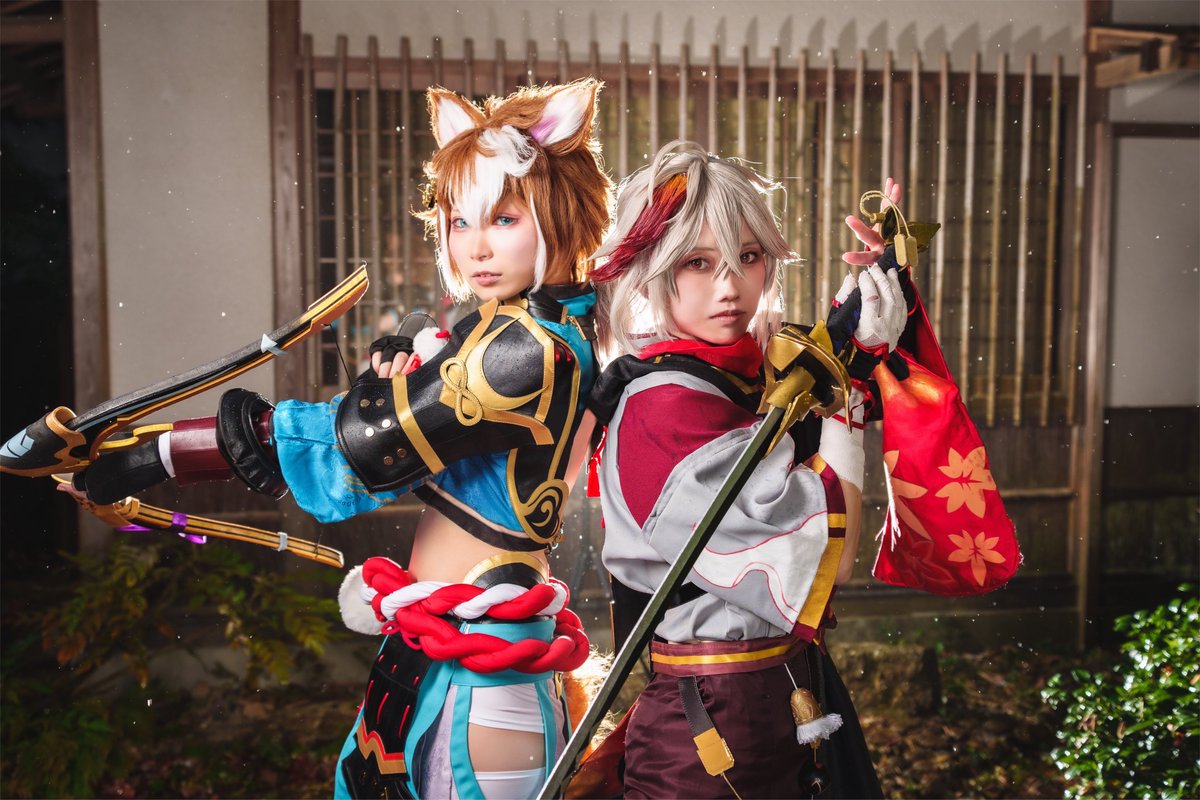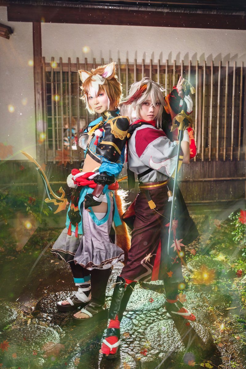 Cosplay / 原神 楓原万葉 :@hua_cos ゴロー:@hina_03saku77 ─────────────── 幕府軍対抵抗軍 「久しぶりでござるな、友よ」 「あぁ!」 p.@kenosaka1977 #1120稲妻紅葉祭