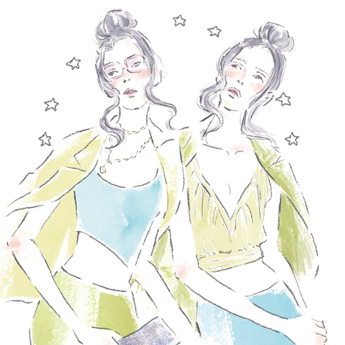 12星座イラスト。双子座。 ラッキーカラーを使った大人のコーデ。 #双子座 #占いイラスト #12星座占い #12星座 #占い #占星術 #イラスト #イラストレーション #ファッションイラスト #イラストレーター #水彩 #adobephotoshop #illustration