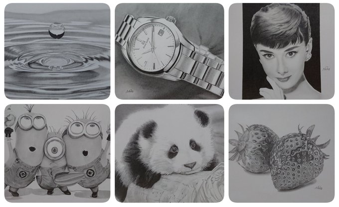 #12月になったので自己紹介する #12月になったのでフォロワーさんに自己紹介しようぜ 最近は人物以外も色々描いてます✐☡🐈 ※趣味です😊 #鉛筆画 #シャーペン画 #模写 #似顔絵 #水 #腕時計 #オードリー・ヘップバーン #ミニオンズ #パンダ #いちご #みんなで楽しむTwitter展覧会