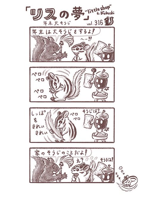 #1日1絵 過去の絵。#12月29日 1枚目 昨年のマンガ「リスの夢」。 リスの大そうじ⁉︎ ある年の年賀状ボツ案 大掃除 お正月準備。 #リス #シマリス #イラスト #illustration #illustrator