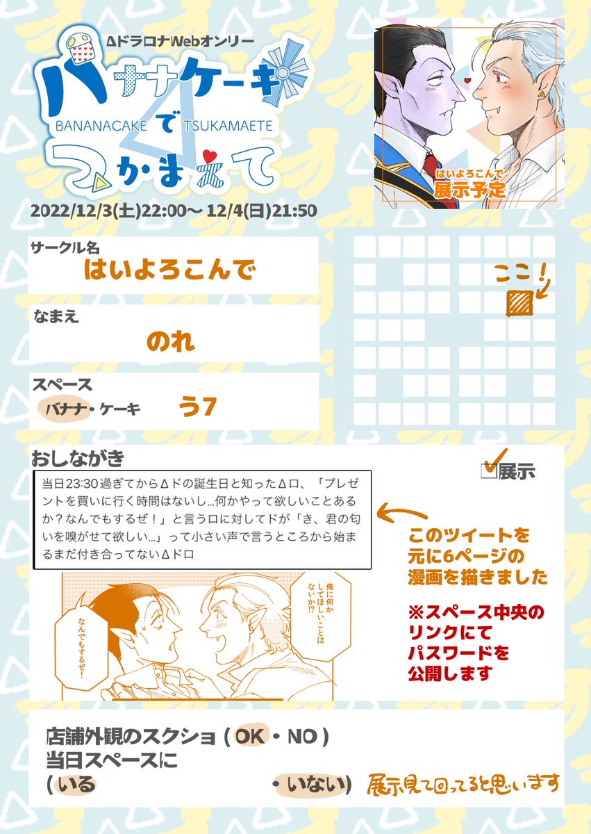 ΔドラロナWEBオンリーのお品書きです! 前にツイートした誕生日にロ君の匂いをかぎたいって言う隊長の漫画を6ページ描きました スペース内中央のリンクからパスワードと展示(ポイピク)に飛べるようにしてます、イベント終了後にパスなし公開しますのでゆっくりで大丈夫です! #1204delta_DR