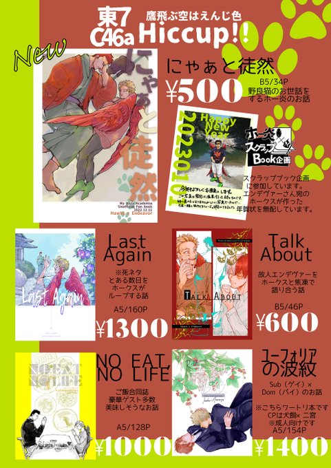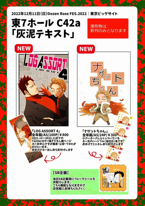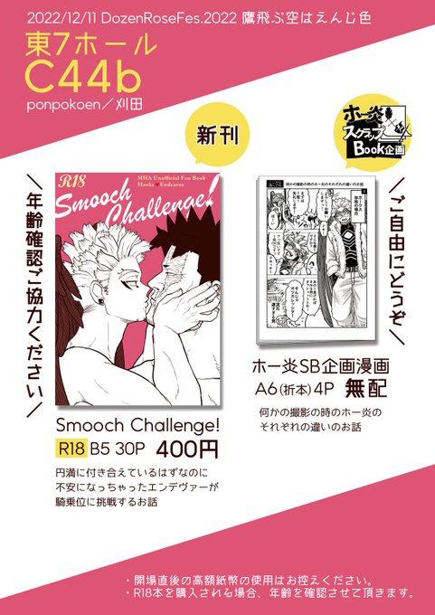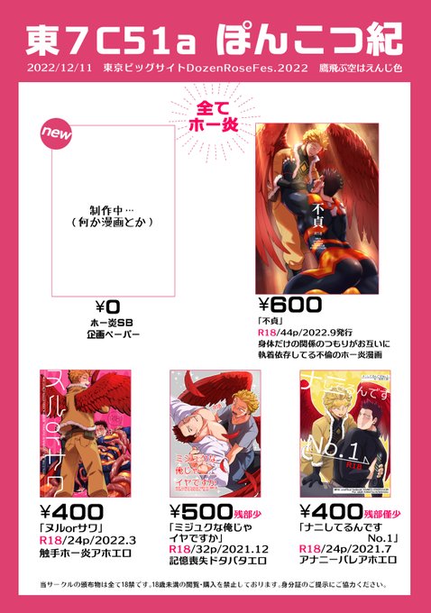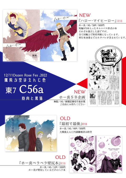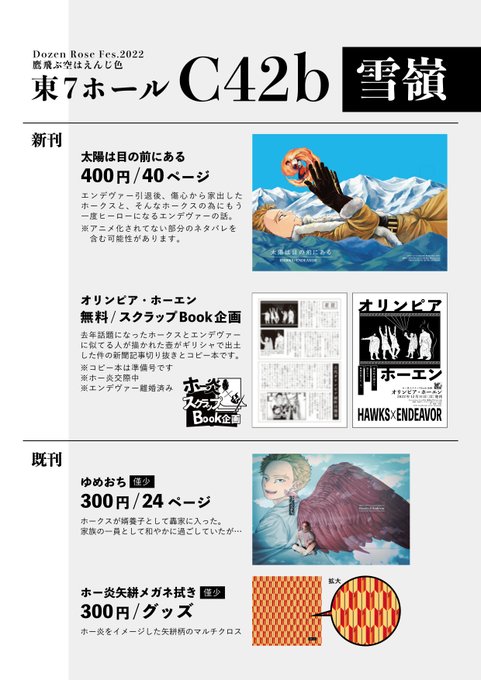 12/11 Dozen Rose Fes.2022 ホー炎オンリーのお品書きです🦅🔥 当日の新しいものはペーパー漫画のみになります ■9月の既刊⇒pixiv.net/artworks/10122… 今年出した分の在庫はいっぱい持っていきます!💪 #1211鷹えん新刊情報