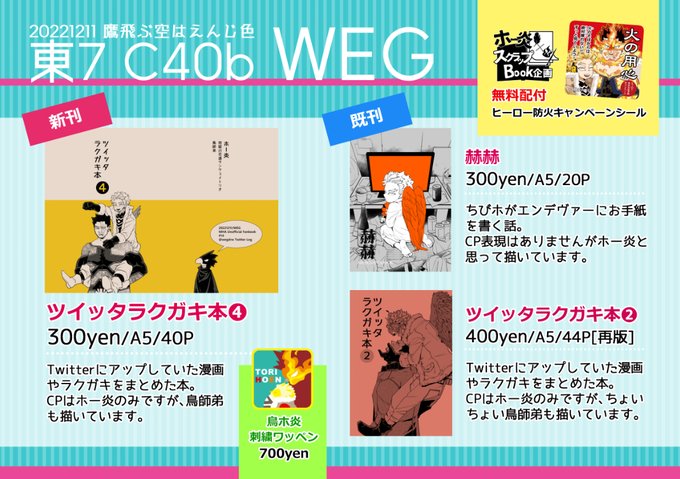 12/11鷹えんのお品書きと目印ポスターです ホー炎SB企画の無配は今作ってます…!🏃 各本の詳細はこちらにまとめていますpixiv.net/artworks/10347… #ホー炎SB企画 #1211鷹えん新刊情報 twitter.com/dc_saka/status…