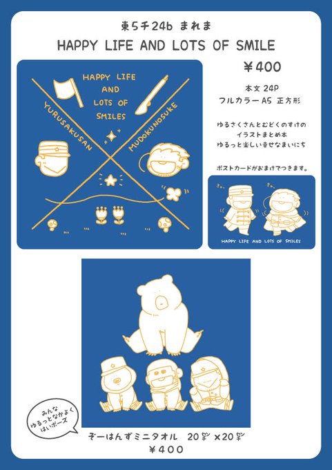 12日のお品書きです ゆるさくさんとむどくのすけのtwitterイラストまとめ本 ¥400 HAPPY LIFE AND LOTS OF SMILE A5正方形 本文28P フルカラー ポストカード付き ぞーはんずミニタオル ¥400 ペーパーラリーのペーパー 今までのグッズを少々 トリオキニ、ツリーに繋げます✨ #1212勇尾プチお品書き