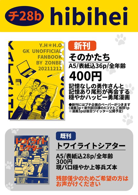 #1212勇尾プチお品書き ギリギリですがお品書きです。明日はよろしくお願いします。 新刊サンプル⇒pixiv.net/artworks/93974… 当日は11時頃まで離席しますが売り子さんがいるので気にせずお立ち寄りください。トリオキニでお取置きの方につきましてはQR読取は致しませんのでご申告頂けますと幸いです。