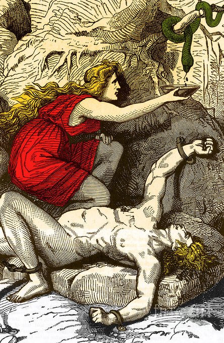 Loki, Norse God, 19th century illustration of the mythological Scandinavian God in chains, 1882 #loki #norsemythology #mythology #illustration #scandinaviangods #art #19thcentury