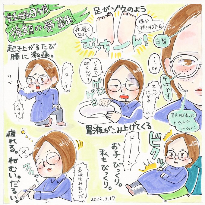 2022.3.17 妊娠9ヶ月 後期の受難 あと少しで産まれるんだな〜と実感してきたよ!出産こわ!でも楽しみ! #illustration #イラスト #育児日記 #育児漫画 #透明水彩 #6歳育児 #ステップファミリー #絵描きさんと繋がりたい #エッセイ #エッセイ漫画 #日常漫画 #妊娠32週 #2人目妊娠中