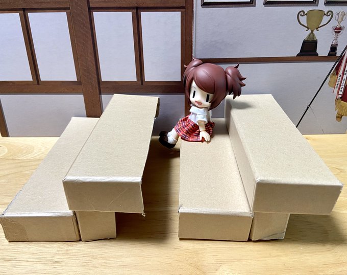 #2月を写真4枚で振り返る 箱の蓋で作ったテーブルでしょうか。 リーメント社やガチャのミニチュアテーブルじゃキューポッシュやねんどろいどどーるには小さかったんで… 代用は簡単に作れる発見ですね