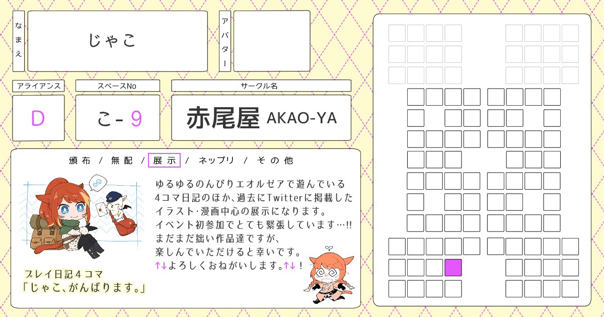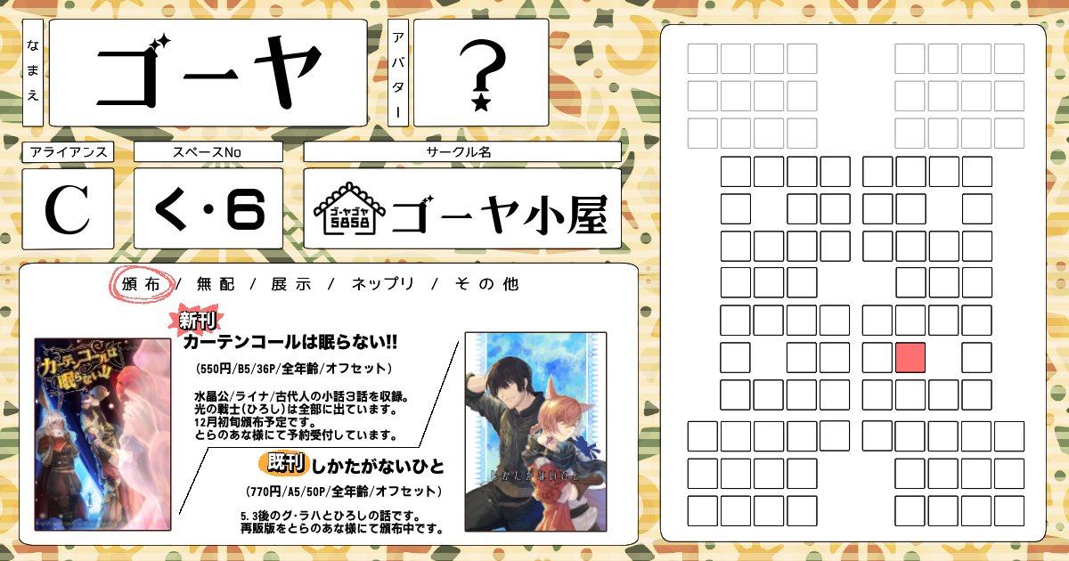 #2021冬頭割り_サークル参加表 11/14(日)開催のリモート同人イベント『頭割りだョ!ヒカセン集合3』にてプレイ日記4コマと過去にTwitterに載せたイラスト・漫画の展示をさせていただきます! 初参加なのに準備がギリギリすぎてまだまだ描いてる最中ですが;▽;` 少しでも作品増やせるよう頑張ります!