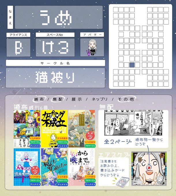 告知しますー! 頭割り3は新刊予約受付と既刊頒布で参加します! 今回展示やエアスケブはスケジュール都合で難しいので寂しいスペースですがよければ見にきてやって下さい! 🐯さんで新刊予約はじまったのでよければ→ecs.toranoana.jp/joshi/ec/cot/c… #2021冬頭割り_サークル参加表