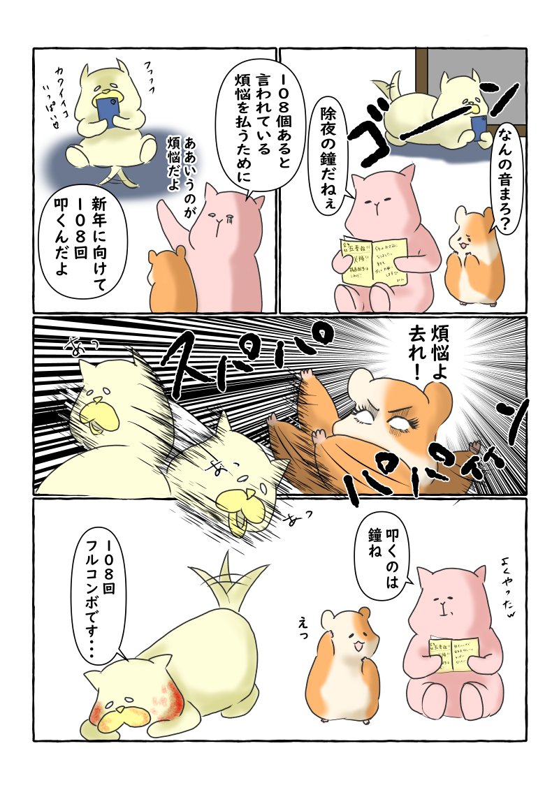【除夜の鐘】 今年1年、漫画を更新して沢山の方に読んでいただいて大変嬉しく思います。 来年もまた宜しくおねがいします🧡 良いお年を(人*´∀`)。*゚+ #漫画が読めるハッシュタグ #絵描きさんと仲良くなりたい #アトリエの系譜S #ハムスター #2021年お世話になった人達